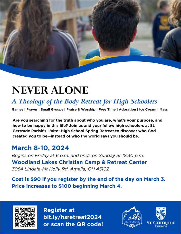 Are you searching for the truth about who you are, what’s your purpose, and how to be happy in this life? Join your fellow high schoolers March 8-10 at St. Gertrude Parish’s L’alto: High School Spring Retreat to discover who God created you to be—instead of who the world says you should be. The retreat will be at Woodland Lakes Christian Camp & Retreat Center. Visit bit.ly/hsretreat2024 to learn more and register.