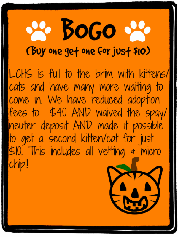 During the week of October 18th-24th, an approved applicant can adopt a fully-vetted cat for free and an adult dog over 6 months of age for $25.00. Kittens will also be free but will require a refundable $50 spay/neuter deposit which is refunded once the adopter follows through with the spay/neuter appointment. All applicants must complete an adoption application and be approved to qualify. The event will continue throughout the week until the funding is expended.