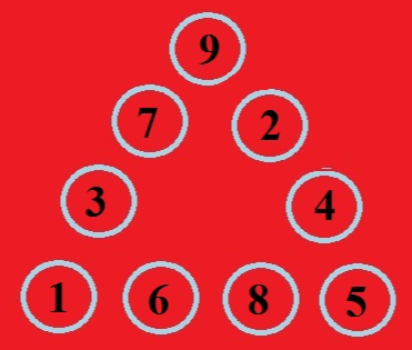 - In the picture below, using every number between 1 and nine, fill in the circles so each side of the triangle adds up to 20.