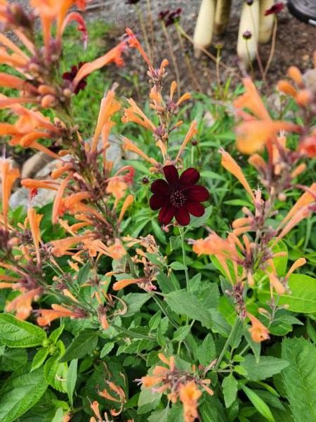 What is that deep red flower in the center of this orange Agastache? It is chocolate cosmos. Yes, it is a deep red cosmos whose flower truly smells like chocolate. This photo was taken in our Kid's Garden last summer.