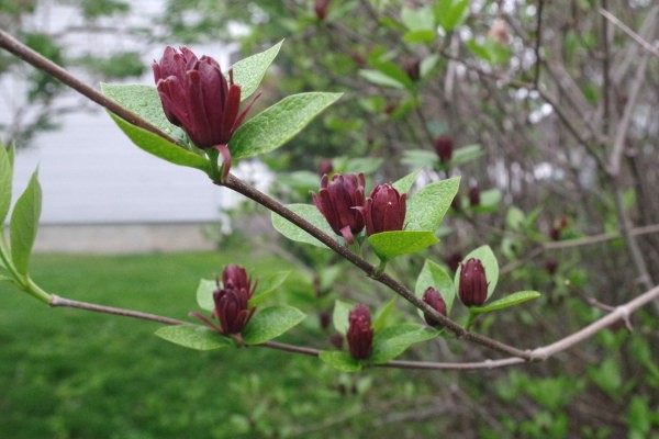 Carolina allspice (Calycanthus floridus) is in bloom. This is a very hard working native shrub that is not eaten by deer and forms a large thicket that the birds love to nest in. The flowers are an unusual shade of deep, wine red and smell like ripe pineapples when in bloom on a warm, sunny day. In fact, some people call this the "pineapple bush". This picture was taken in my yard on Sunday morning. I planted this very old fashioned shrub when I first moved in, right next to a big, old fashioned lilac. We have plants of Carolina allspice in stock right now. | |