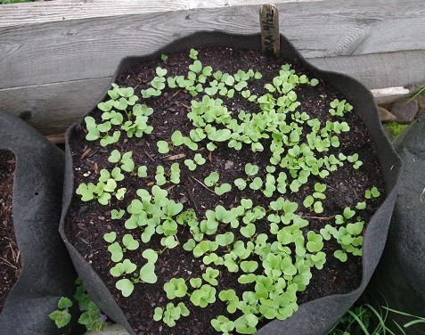 I use both 20 gallon and 10 gallon Smart Pots. The larger ones are good for one tomato plant and cage or 3 pepper plants. Last year I grew parsnips and potatoes in 10 gallon Smart Pots. Above you can see one of my Smart Pots planted with radish seeds on April 22nd. I will thin them this week and EAT THE THINNINGS as microgreens! I should be harvesting radishes by May 22nd.