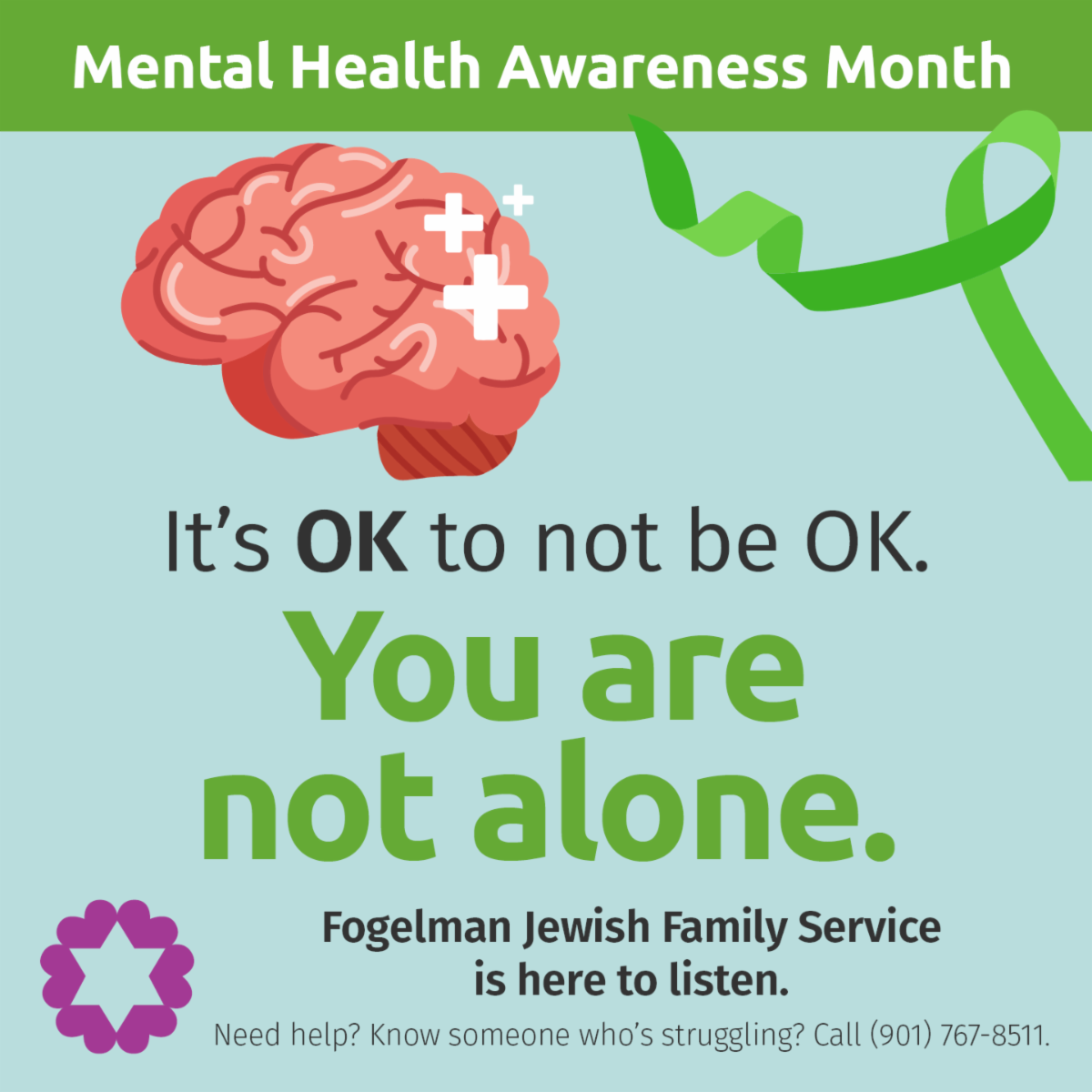 May is Mental Health Awareness Month and Wendy and Avron B. Fogelman Jewish Family Service is here to listen. Throughout the month of May, Fogelman JFS staff will be working hard to spread awareness. Doing things such as wearing green to raise awareness, handing out stickers with phrases such as “going to therapy is cool” and “grow through what you go through”, and creating an interactive wall stating “It makes me happy, when skies are grey” for members of the MJCC community. Fogelman JFS will be making phone calls and reaching out to individuals about needs and services as well.