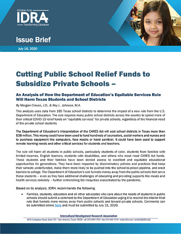 Muchas organizaciones han presentado informes amicus ("amigos de la corte") en las demandas, con varios informes que citan el análisis reciente de IDRA, Cortar fondos de escuelas públicas para subsidiar escuelas privadas. El análisis muestra que la nueva regla del Departamento podría costarle a 185 distritos escolares de Texas un total de más de $44 millones, un adicional de $38.7 millones más de lo que se requiere para los servicios de escuelas privadas según las reglas normales.