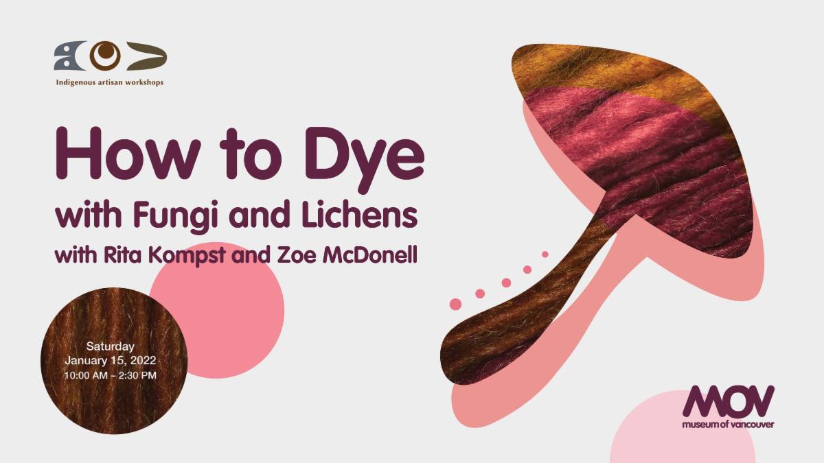 This hands-on workshop will be taught by a traditional Musqueam Coast Salish artist as well as an ecologist as they cover the many facets of our natural world through fibre. They will cover how to identify, process and dye with a wide range of different mushrooms and lichens from our forests. Your dye colour pallet will grow exponentially as we explore and celebrate the rich networks under our feet.