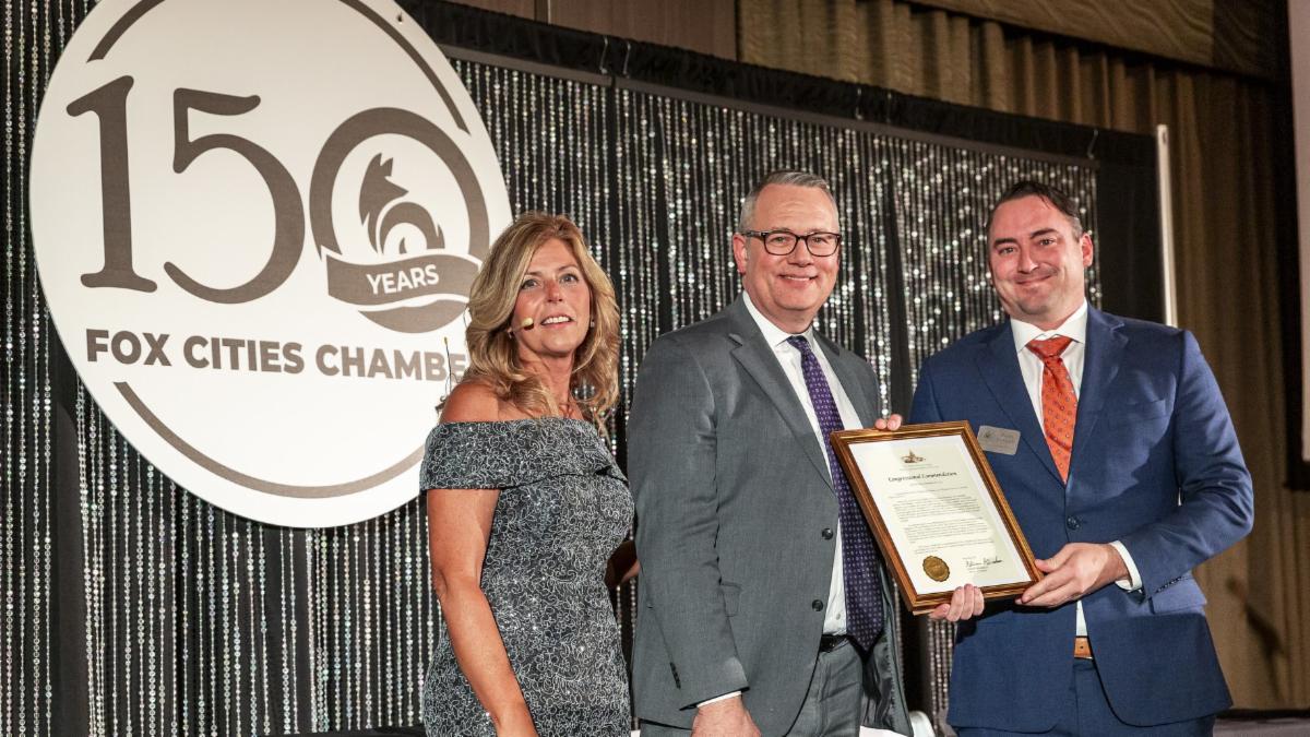 At "Celebrate: A Toast to 150," Dustin Hackbarth from U.S. Representative Glenn Grothman’s office presented the Chamber CEO and board chair with a Congressional Commendation for 150 years of service to the Fox Cities community.