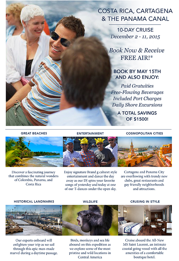 Dan Howell Travel/Vacationgay.com is excited to announce a 10-day South & Central America cruise beginning in Cartagena, Colombia and ending in the lush jungles and marine parks of Costa Rica, including a daytime crossing of the Panama Canal. Brand g Vacations has chartered the M.S. Saint Laurent, an intimate and charming 110 stateroom, ocean-going coastal vessel. Her spacious indoor and expansive outdoor public areas make her an ideal vessel for exploring destinations larger vessels cannot reach.
