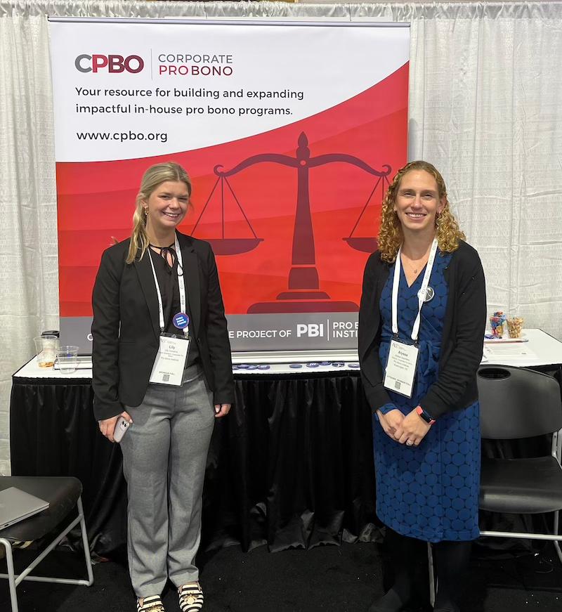 WHAT HAPPENS IN LAS VEGAS STAYS IN LAS VEGAS? – Nope. We've been working hard at the Association of Corporate Counsel Annual Meeting. Lily Constine, PBI Project Coordinator, and Alyssa Saunders, Director, Corporate Pro Bono, (shown below, L to R) and Eve Runyon, PBI President & CEO, met with colleagues in the exhibit hall, handing out advice and #ProBonoProud buttons! | |
