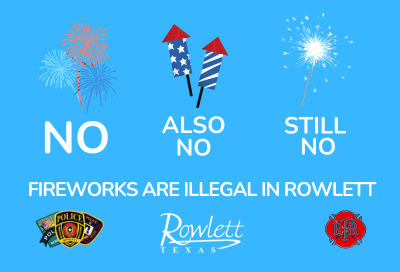 It is illegal to possess or use fireworks in Rowlett. Please don't call 911 if someone is shooting off fireworks in your neighborhood - help us keep those lines open for emergencies - call the non-emergency number, 972-412-6200, option 1 for dispatch.