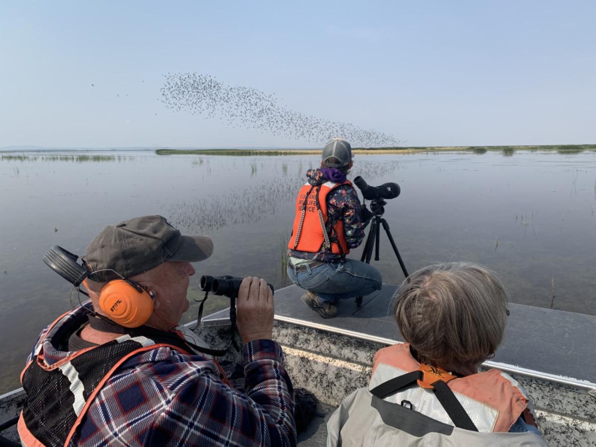 I was thrilled when Teresa invited me to help with the shorebird survey on Malheur Lake. We would travel by airboat, a new experience for me. Alexa Martinez, Malheur NWR Wildlife Biologist, was our expert boat captain. Our crew included Teresa, another volunteer Jody Golightly, and me. We set out along the Blitzen River, and soon we were in the vast expanse of the lake with birds EVERYWHERE!