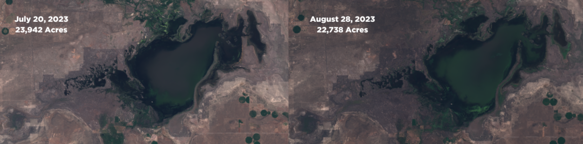 As of August 27, 2023 the lake is around 22,783 acres. I know you all were expecting the lake to reach the Narrows, but unfortunately it will not be reunited this year. Never fear, there is still much exciting news from the Lake! It has been host to an abundance of submerge aquatic vegetation, macroinvertebrate, and lots of emergent vegetation on the lake. We have also observed a great number and diversity of birds! If you look closely in the newest photo, you can actually see emergent bullrush and cattail represented by the dark green areas on the edges of the Lake. The lighter green is a mix of filamentous green algae and submerged aquatic vegetation.