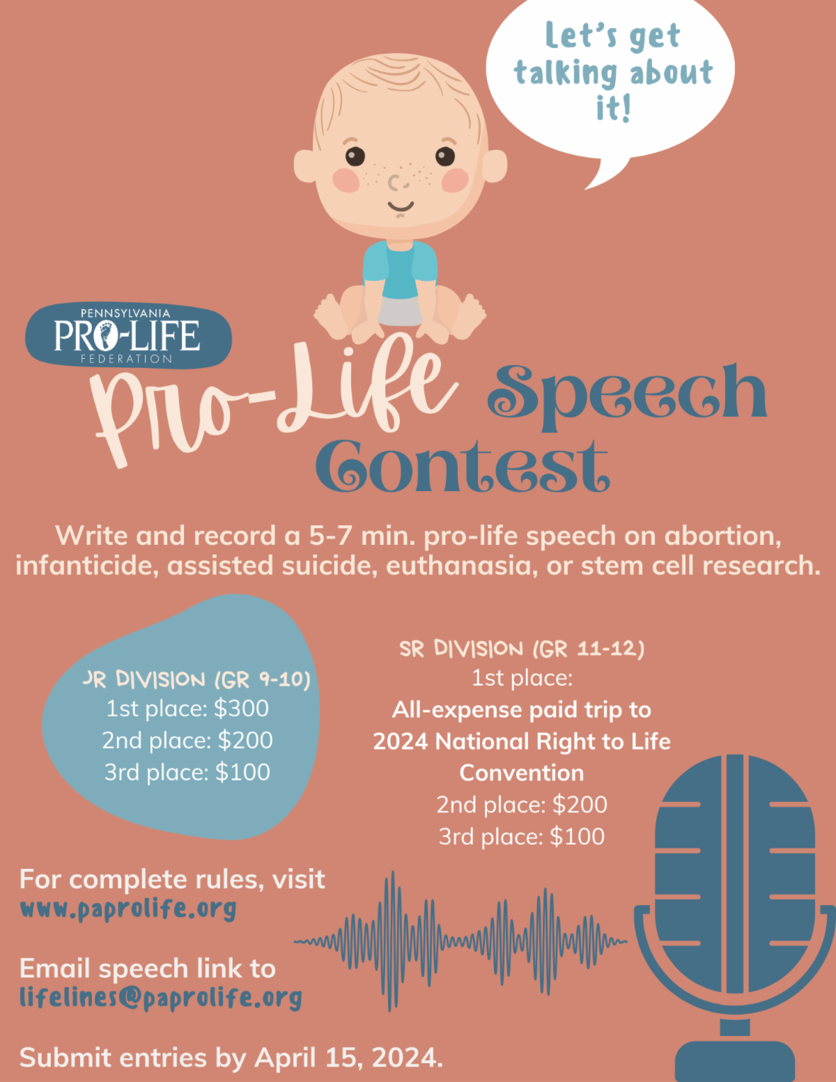 Do you know any high school pro-lifers? 2024 Pennsylvania Speech Contest is the perfect opportunity to use their voice to defend the defenseless. Encourage them to enter by speaking on any topic related to abortion, infanticide, assisted suicide or euthanasia.