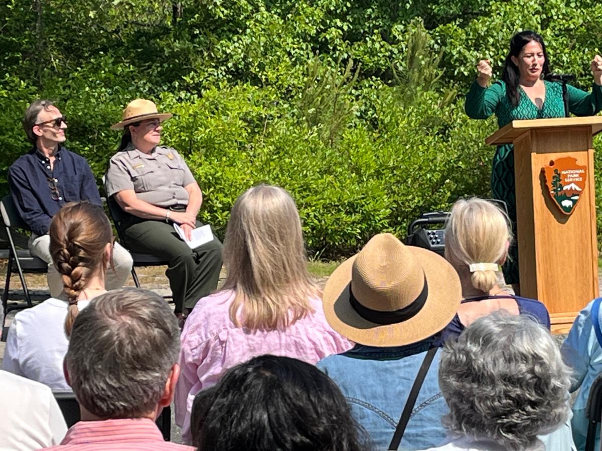 The morning picnic table unveiling event at Beech Forest featured over 100 visitors in attendance, as well as speeches from park Superintendent Jen Flynn, Library of Congress Literary Director Clay Smith, and U.S. Poet Laureate Ada Limon. In the afternoon, the park hosted a minor event for park partners with Ms. Limón to discuss her special connection to Cape Cod as a former Fine Arts Work Center fellow and promote future poetic programming through park partnerships. Learn more about the "Poetry in Parks" program here. | |