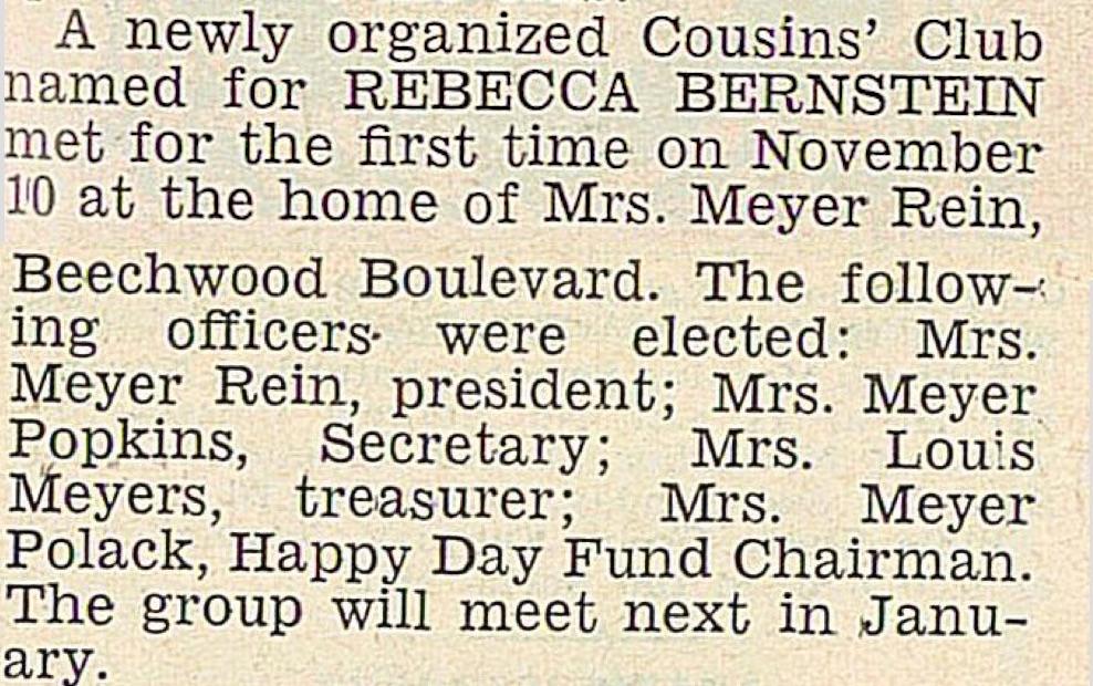 Almost exactly three years later, on November 10, 1955, the second and third generations of the family formed the Rebecca Bernstein Cousins Club. The latest known documentation of the club was published in April 1964.