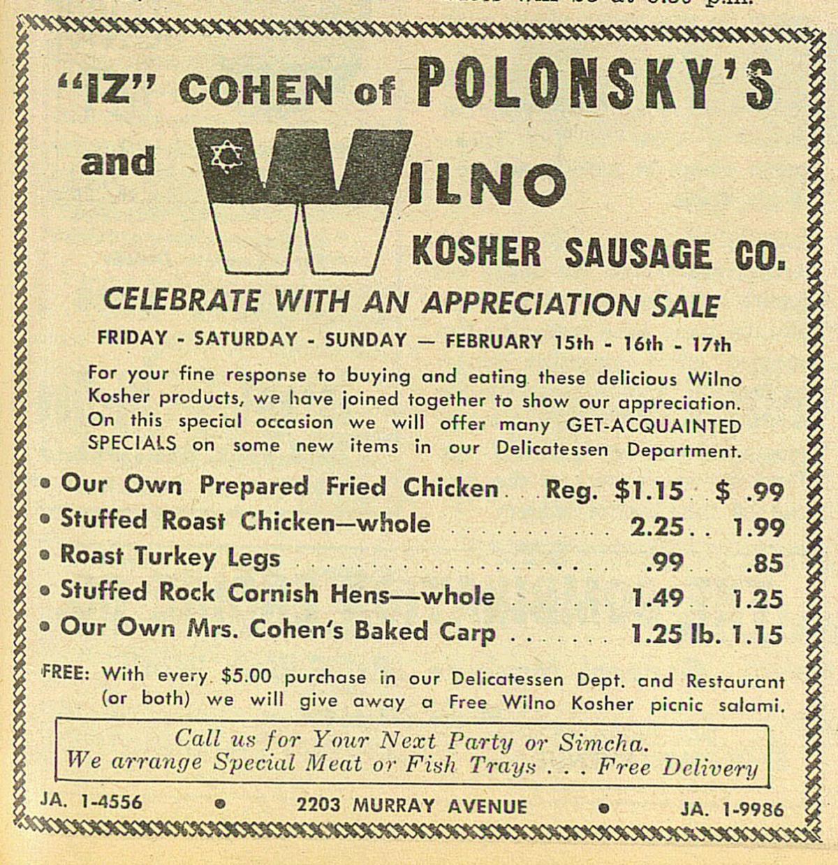 [LEFT] Advertisement for Iz Cohen of Polonsky’s at 2203 Murray Ave. in Squirrel Hill. Advertises Wilno Kosher Sausage Co. products. (Jewish Chronicle, February 15, 1963, Pittsburgh Jewish Newspaper Project); [Right] Advertisement for Iz Cohen of Polonsky’s at 2203 Murray Ave. in Squirrel Hill. Announces reopening following repairs after fire damage. (Jewish Chronicle, August 7, 1969, Pittsburgh Jewish Newspaper Project). | |