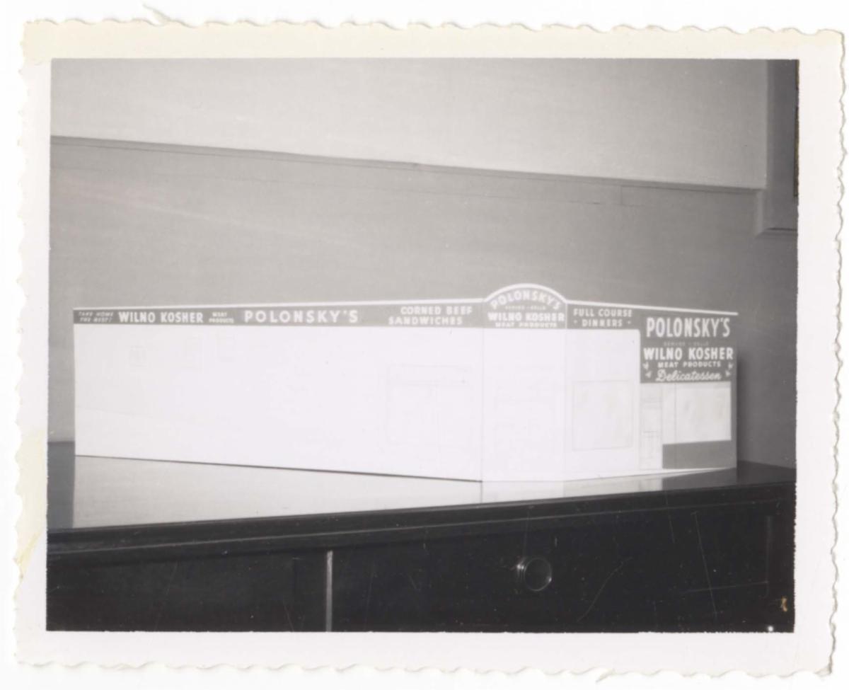 Photograph showing mock-up of façade for Polonsky’s Deli at Murray and Douglas in Squirrel Hill, created by the McBride Sign Company.