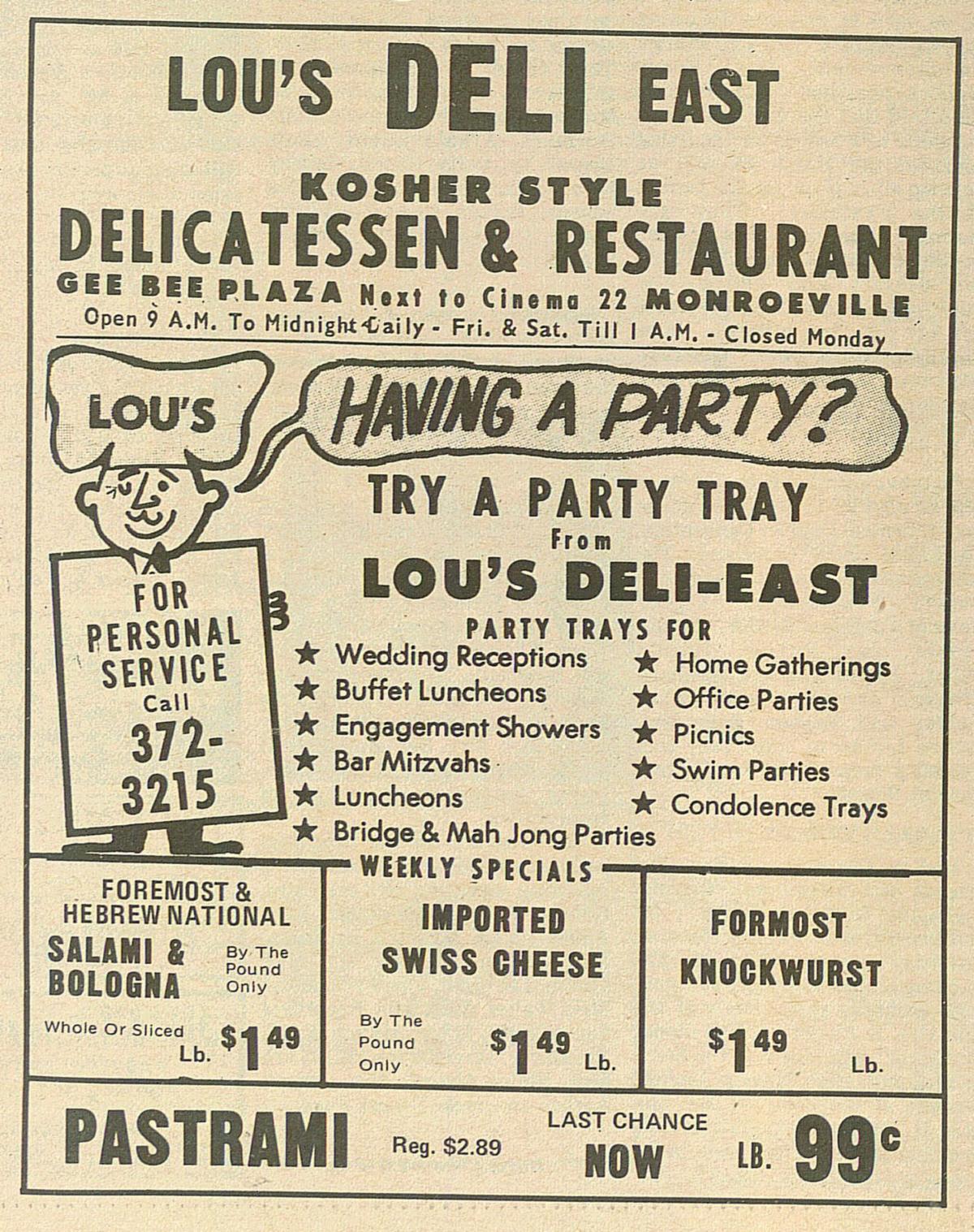 A decade later, in 1972, Lou’s Deli East opened next to Cinema 22 in Monroeville, in the former “Gee Bee Plaza,” now called Jonnet Plaza.