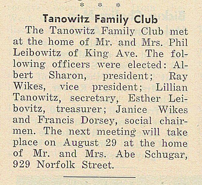 Known surnames in the Tanowitz Family Club include Dorsey, Liebovitz, Schugar, Sharon, Tanowitz, and Wikes. The club met at homes in Squirrel Hill, the East End, and towns throughout the Allegheny Valley including New Kensington and Breckenridge. Known meeting places including 929 Norfolk St. (Abe Schugar residence); 4249 Upview Terrace (Albert Sharon residence); 3751 Beechwood Blvd. (Louis Tanowitz residence); 359 Vernon St., New Kensington (Irwin Dorsey residence); 965 Morgan St., Breckenridge, Pa. (Ray Wikes residence); Breckenridge, Pa. (Joe Wikes residence); 1127 King Ave. (Phil Leibovitz residence); Irv Tanowitz residence; and Highland Park.