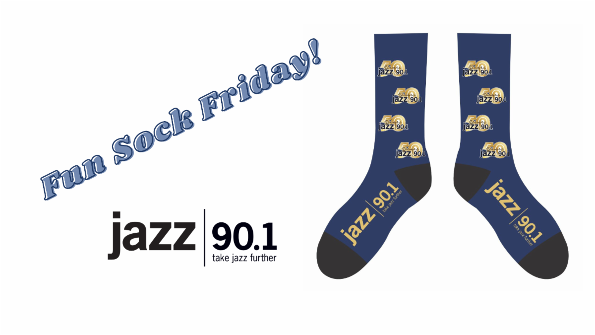 Show your support for Jazz90.1, and have comfy feet, too! Pledge just $90.10 or more today, and you can choose these limited-edition Jazz90.1 navy 50th anniversary socks as your gift, while supplies last. Available In medium and large.