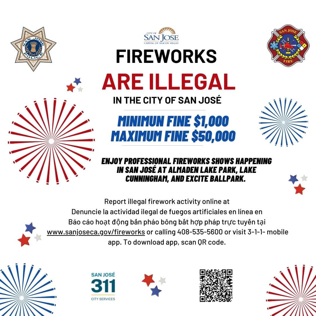 Fireworks are illegal in San Jose! It’s just not worth it. Please report illegal fireworks online at www.sanjoseca.gov/fireworks, by phone at (408) 535-5600, or via the 3-1-1 mobile app. | |