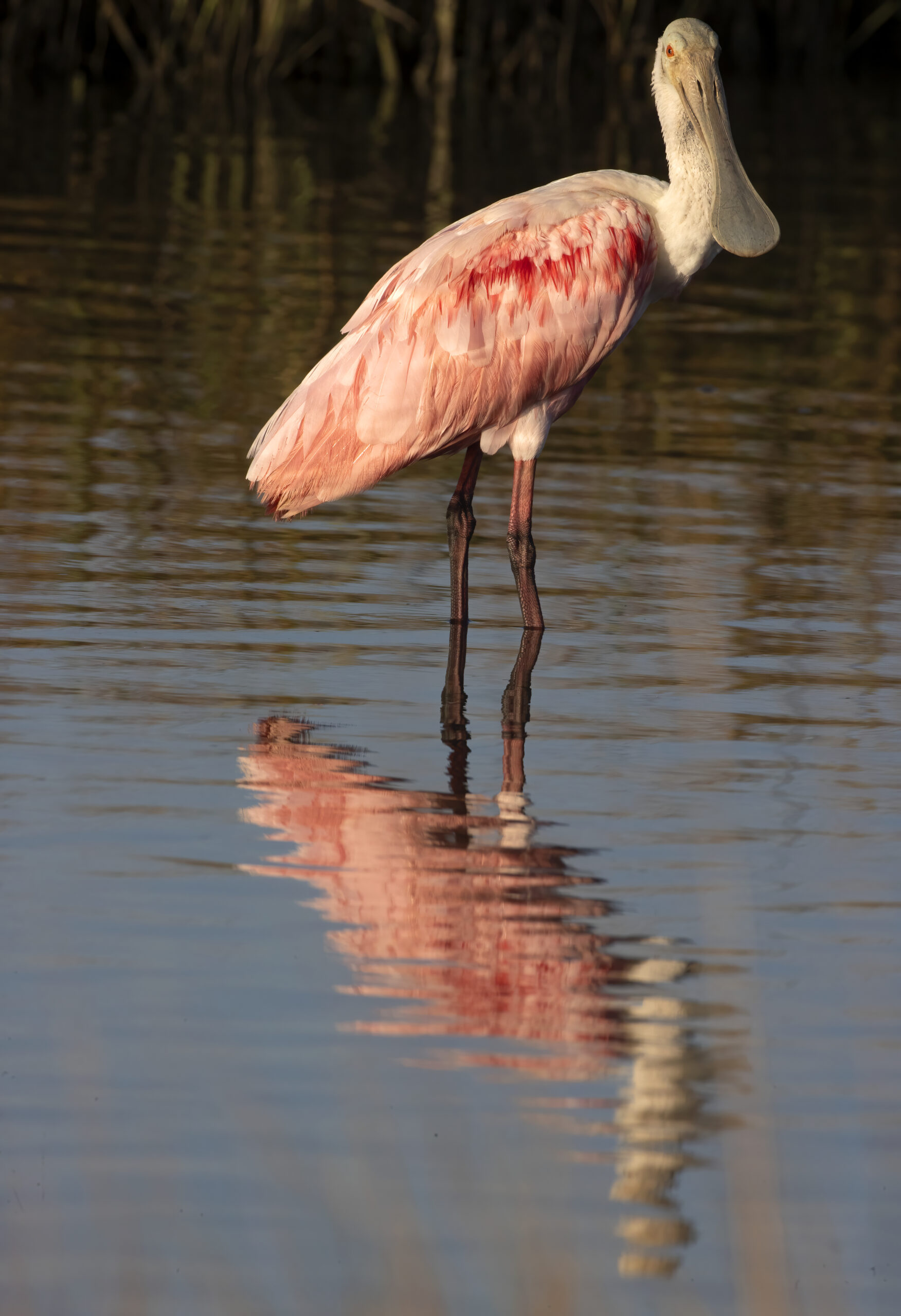 Roseate Spoonbills frequent tidal pools, brackish lakes, ponds, and swamps. They are typically coastal but can stray further inland during short range migration. These habitats provide the spoonbills their food source of typically minnows, small crustaceans, small plants, and insects. It feeds by sweeping the bill from side to side gathering these items from shallow muddy water.