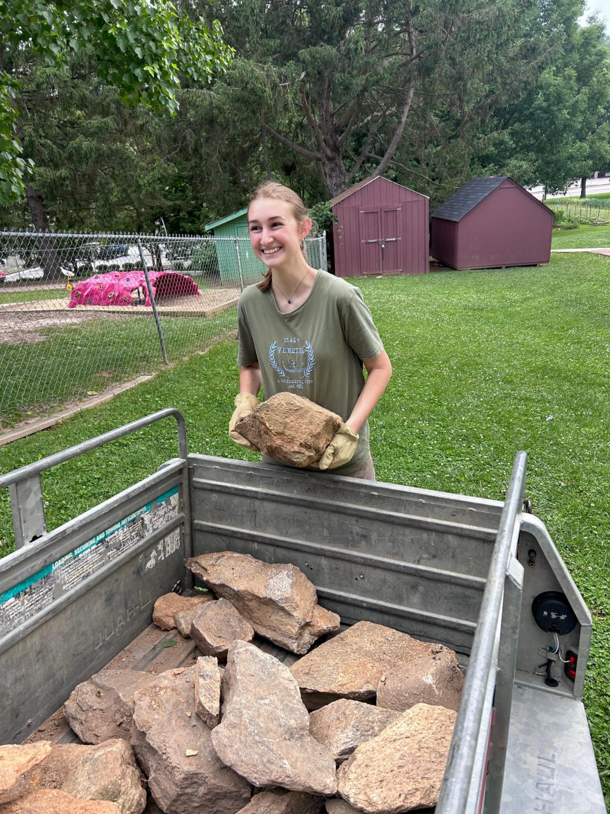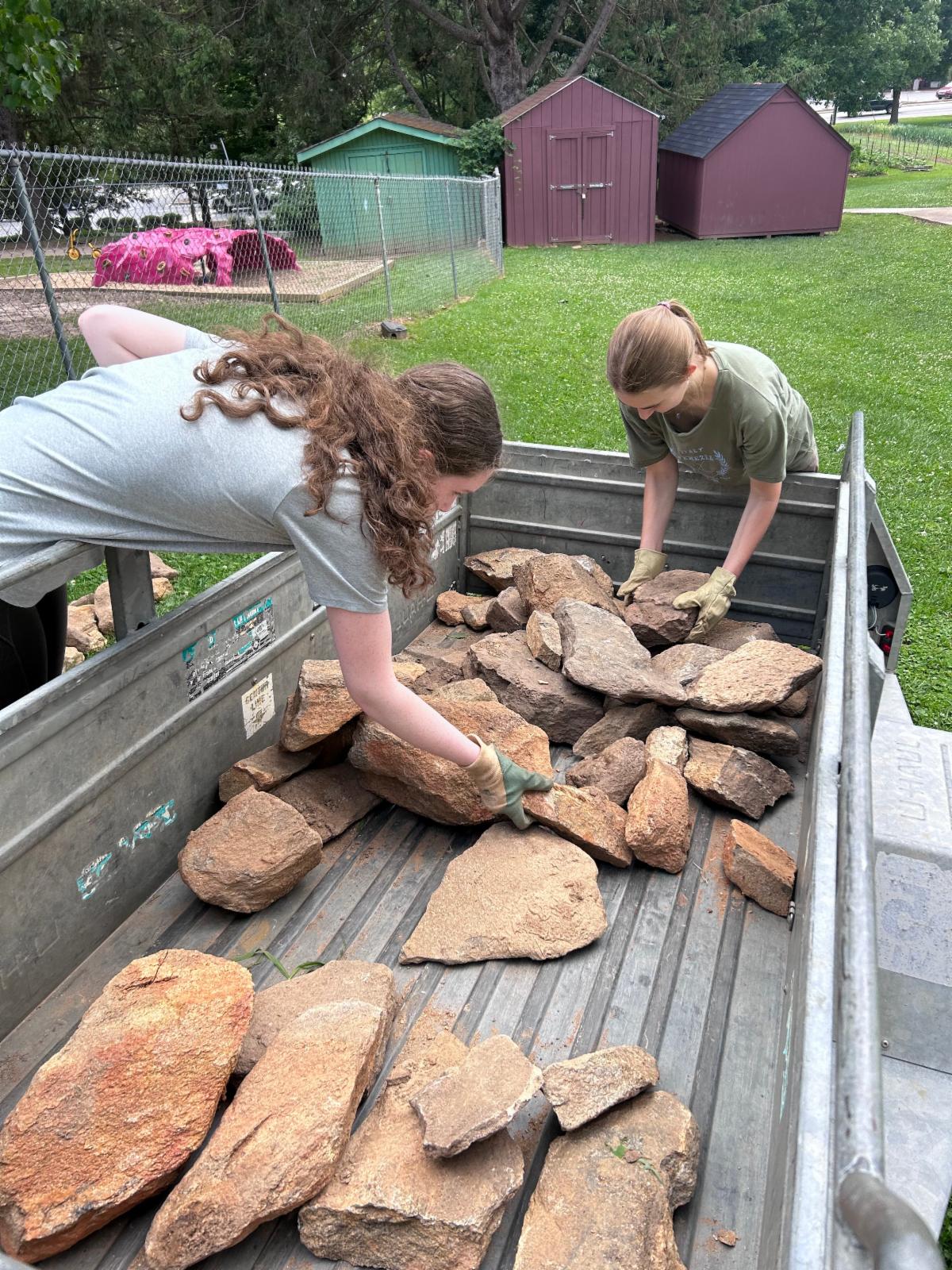 Last week, GCPC member, Betsy Richards got a trailer from U-Haul and picked up a bunch of stone from Jonathan Ross’s house. She used it to expand the borders of the butterfly garden. Here are some pictures of GCPC Earth Team member, Laura Seddon, and her friend helping to move those rocks into place.