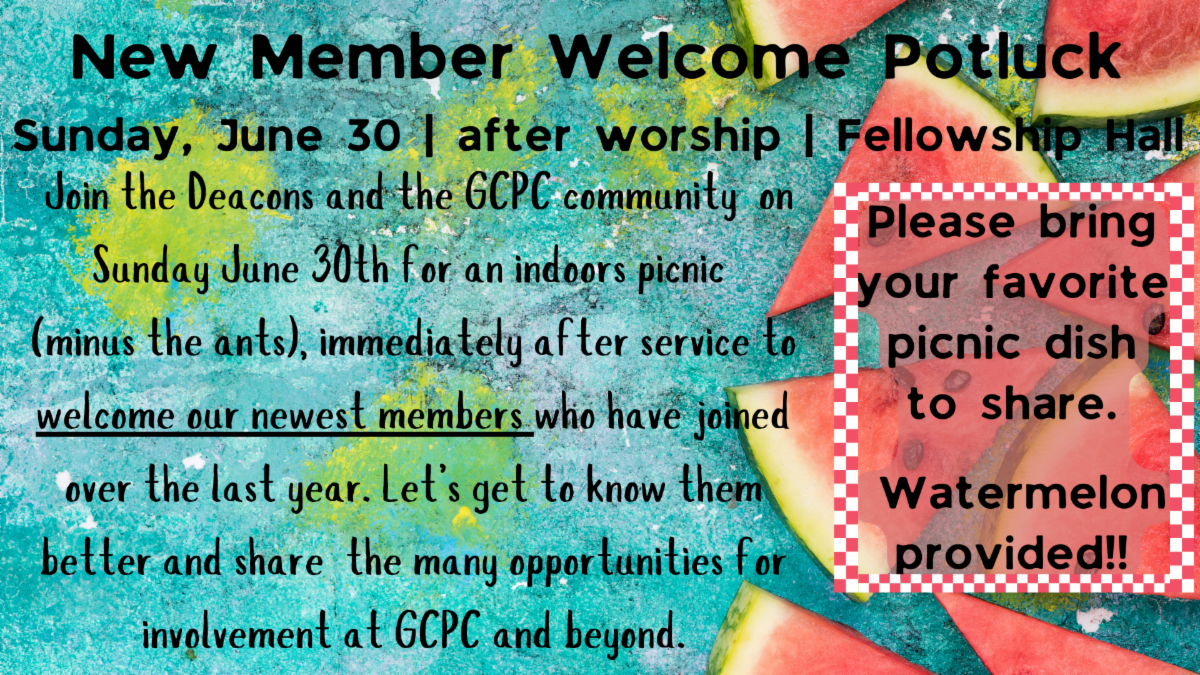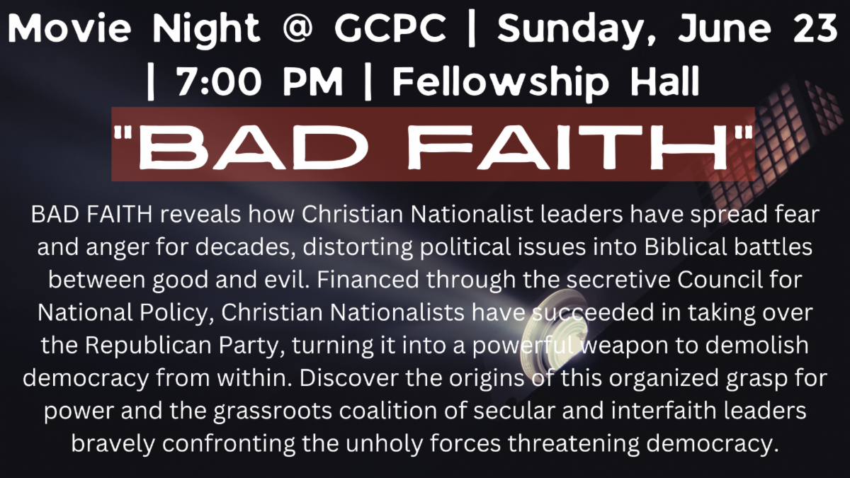(In-person and online) | 10:00 am | Sanctuary (also on Youtube) | | Sunday, June 23 | GCPC Movie Night