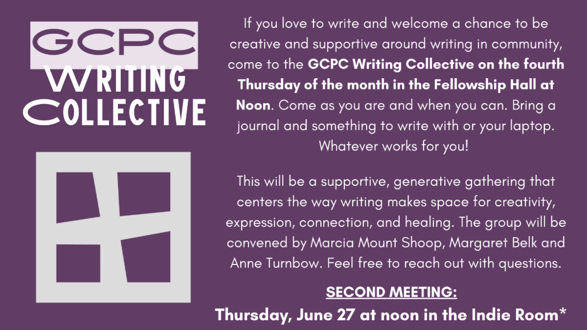 (Team 1) | 9:00 - 11:00 am | Community Garden | | Wednesday, June 26 | Lectionary Bible Study | 12:00 pm | Meeting Rm 202 (also on Zoom) | | Wednesday, June 26 | YTL Food Distribution | 4:45 | GCPC Courtyard | | Wednesday, June 26 | Centering Prayer | 6:00 pm | Sanctuary | | Thursday, June 27 | GCPC Writing Collective | 12:30 pm | Indie Room (note room change) | | Thursday, June 27 | Power & Race Team (PART) Mtg | 6:00 pm on Zoom | | Saturday, June 29 | Memorial Service for Charlie Clogston | 1:00 pm | Sanctuary