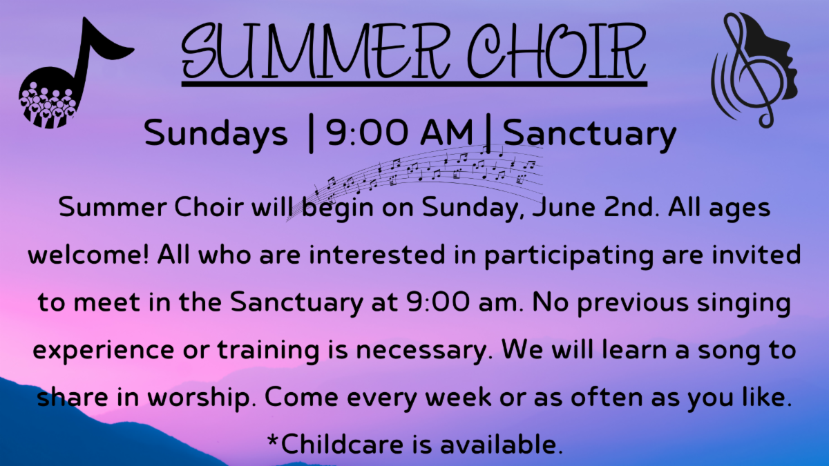 "UPRISING!" | 4:00 pm | Sanctuary | | Sunday, June 23 | Summer Choir | 9:00 am | Sanctuary | | Sunday, June 23 | Hybrid Worship