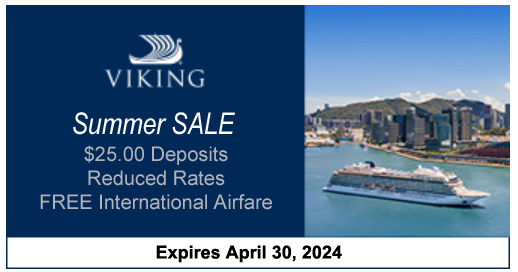 Fares are per person based on double occupancy and are subject to availability. Viking Cruise package rates are based on veranda staterooms and are inclusive of round-trip air from select air gateways. ground transfers, port and government fees unless specified. Additional restrictions may apply. Please inquire for details. Offers may be removed without notice and our lowest prices guarantee is based on cruise line terms and conditions. Book and deposit by April 30, 2024. 2024: Pay in full by May 31, 2024 or at 120 days prior to departure (whichever comes first). | |