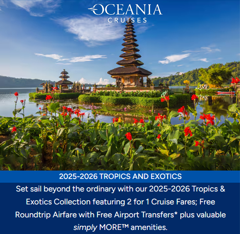 *Offers and fares are subject to change on July 1st, 2024. Visit OceaniaCruises.com for current pricing. All fares are per person, valid for residents of United States and Canada, based on double occupancy (unless otherwise noted) – except fares for Solo category are for a single traveler and are based on single occupancy – for new bookings only and may be withdrawn at any time. Free Internet amenity does not include streaming and includes a login for the first two devices per stateroom. Visit OceaniaCruises.com/internet for more details. simply MORE amenities are per stateroom, based on double occupancy and subject to change; except simply MORE amenities for single travelers who are booked in a Solo category, and are at the per guest rate. simply MORE free shore excursion credit varies by voyage and is up to $1,400 per stateroom, except for Grand Voyages as amenity value varies according to voyage length and for single travelers booked in a Solo category as amenity is at the per-guest rate. simply MORE Champagne, Wine, and More amenity is the House Select beverage package and is valued up to $2,800 per stateroom, except for Grand Voyages as amenity value varies according to voyage length and for single travelers booked in a Solo category as amenity is at the per-guest rate. Simply MORE shore excursion credit has no cash value. Not all promotions are combinable. 2 for 1, simply MORE fares are based on published Full Brochure Fares; such fares may not have resulted in actual sales in all suite and stateroom categories and do not include optional charges as detailed in the Guest Ticket Contract which may be viewed, along with additional terms, at OceaniaCruises.com. simply MORE without airfare does not include airfare or transfers. All fares include government fees & taxes. “Airfare” includes ground transfers, and offer applies to coach, roundtrip flights only from the following airports: ATL, BOS, CLT, DCA, DEN, DFW, DTW, EWR, IAD, IAH, JFK, LAX, LGA, MCO, MDW, MIA, ORD, PHL, PHX, SAN, SAV, SEA, SFO, TPA, YOW, YUL, YVR, YYZ. Oceania Cruises reserves the right to assign gateways based on availability for JFK, LGA and MIA. Gateways are subject to change at any time. Free Roundtrip Airport Transfer offer is only available when simply MORE Airfare is purchased through Oceania Cruises. Roundtrip Airport Transfer is included only from the above gateways. Airfare is available from all other U.S. and Canadian gateways for an additional charge. “Airfare” includes all airline fees, surcharges and government taxes. Airline-imposed personal charges such as baggage fees may apply. The privacy and protection of personal data is very important to us, and we collect, use, share and secure that data as described in our privacy policy, which is available on our website at OceaniaCruises.com/legal/privacy-policy. Oceania Cruises reserves the right to correct errors or omissions and to change any and all fares, fees, promotions and surcharges at any time. Ships’ Registry: Marshall Islands. | |