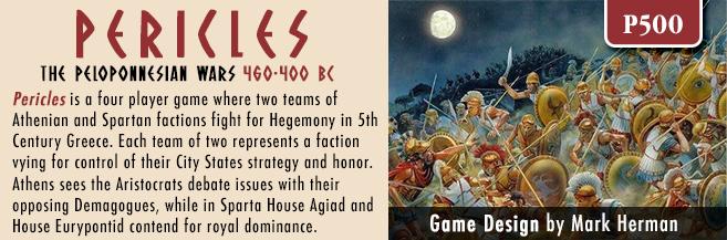 Mark's design and research/teaching skills (as designer of Victory Games' Peloponnesian War and from his many years teaching the Peloponnesian Wars at the Naval War College) have combined to create what I believe will be seen as a masterpiece design on the entire period of the Peloponnesian Wars. Those of you who like this period will find Pericles just dripping with history and theme. If you like Churchill, I think you'll enjoy the way Mark has evolved the "Conference" system to be even better in Pericles. If you enjoy Co-opetition games or just a good solo game that helps you understand the dynamics of the era better, you're going to love Pericles. And if you just plain "love you some Mark Herman games," then you may not be able to contain your excitement, because this is Mark at the top of his craft.