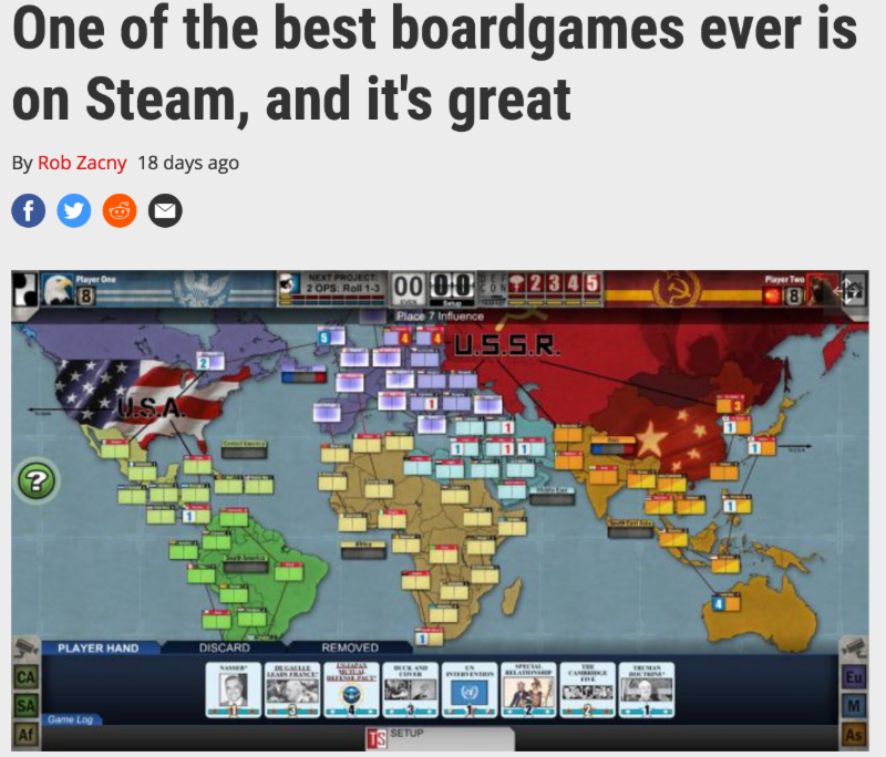 You know, we're often so focused on just continually working to improve that we forget to stop and appreciate our accomplishments. So, especially for our team members and those of you who've played any part at all in helping us create and develop Twilight Struggle and then get it to digital, just stop for a minute and listen to what PC Gamer (Seriously, I never thought I'd see PC Gamer review one of our games....) had to say about the Twilight Struggle Digital version: