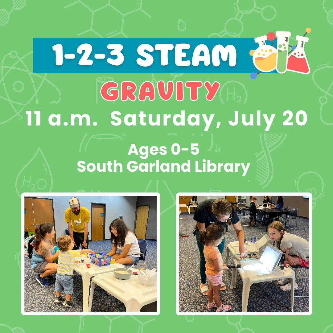 Introduce your little learner to STEAM (science, technology, engineering, art and math) at 11 a.m. Saturday, July 20, at the South Garland Library, 4845 Broadway Blvd. We will be gravity testers as we explore different activities.