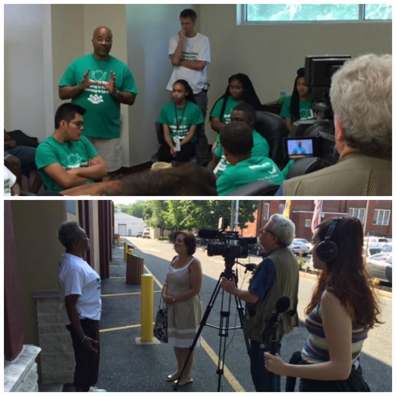 Above, participants in the "Bridgeton Youth: Helping to Feed, Learning to Lead" program get direction from Albert B. Kelly, President and CEO of Gateway and Mayor of Bridgeton. A film crew was there to capture the moment. Also, one of the adult leaders is interviewed. They are creating a video for the Robert Wood Johnson Foundation, which is funding the program. Below, Bridgeton youth canvas neighborhoods.