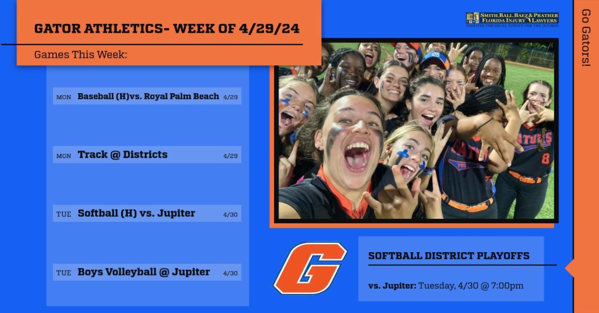 The Lady Gators softball team finished the regular season on a 3-game winning streak, with victories over West Boca, Martin County and Park Vista. With the victories, the team finishes the regular season with a record of 20-3. The Lady Gators begin postseason play on Tuesday 4/30 at 7pm with a home game against rival Jupiter HS (12-6).