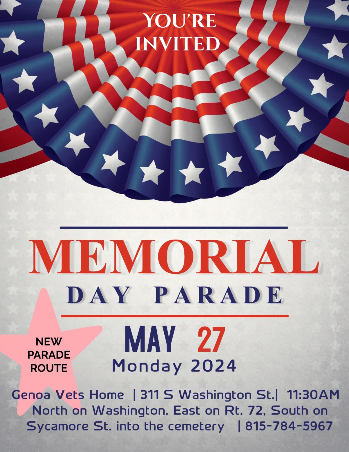 The Genoa Veterans Home at 311 South Washington Street, Genoa, IL 60135, cordially invites you to participate in the 2024 solemn Memorial Day Parade on Monday, May 27, 2024.