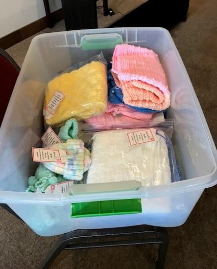 The bins across the front of the church on Sunday morning will hold the work of the members of the Richard Babcock Memorial Yarn Ministry. The hats, mittens, scarves and blankets are tagged, sorted & put into bins and bags for blessing at Grace this Sunday Nov 7th. They are ready for distribution the week of Nov 8th to Galena Food Pantry, Shelter Care Ministries in Rockford, Riverview Center in Galena, Dubuque Rescue Mission and Opening Doors in Dubuque.