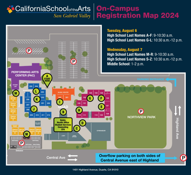 Next, please visit the Planner Pick-Up Station in the 200s Wing (blue building). Students who purchased CSArts-SGV student-designed planners during Online Registration can pick up their planners. If you did not have a chance to pre-order a planner, a limited number will be available for $10, as long as supplies last. Thank you to student Chloe Tubbs (CW, ‘25) for the beautifully unique cover design!