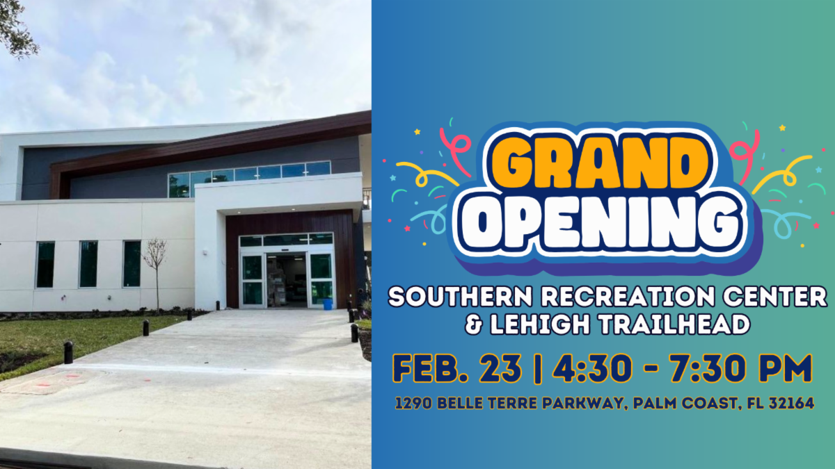 Mark your calendars for the official Grand Opening of the Southern Recreation Center and the new Lehigh Trailhead on Friday, February 23rd from 4:30 - 7 pm at 1290 Belle Terre Parkway, Palm Coast, FL 32164. The Southern Recreation Center is the result of a significant investment in the community. This project was funded in part by the Flagler County Government Tourist Development Council (TDC). The facility boasts a Community Building with offices, restrooms, locker rooms with showers, kitchen dining space, public access to 2 multi-purpose rooms, lobby space, an exterior patio, and a balcony. In addition, the facility's exterior features twelve pickleball courts, six of which are covered for year-round use.