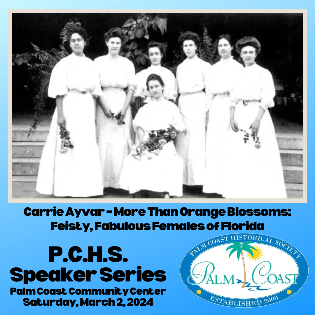 The Palm Coast Historical Society has a FREE Speaker Series at the Palm Coast Community Center the first Saturday of each month. Please join the PCHS and the City of Palm Coast to listen to thought-provoking topics and renowned speakers who will share insights on various subjects. We aim at enriching our community and fostering meaningful connections through these speaker series. Light refreshments will be provided. We hope to see you there! | |