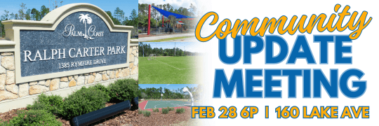 The City of Palm Coast will host a Ralph Carter Park Community Update meeting for residents of the R-Section and users of Ralph Carter Park on February 28th at 6 p.m. The meeting will be held in the community wing of City Hall at 160 Lake Avenue. | |