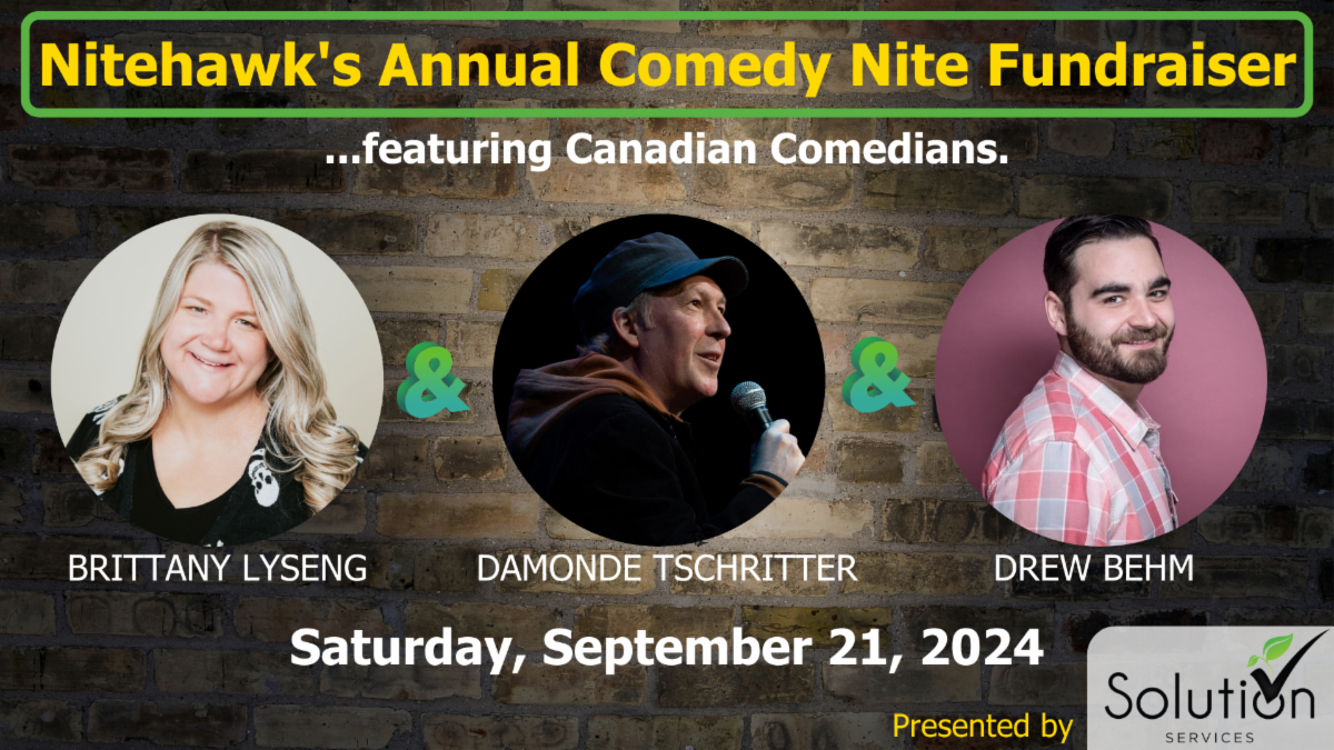 Nitehawk Year-Round Adventure Park would like to invite you to our 28th Annual Comedy Nite Fundraiser - presented by @Solution Services Inc., happening on Saturday September 21st, 2024. This fun filled evening will include Comedy from “The Laugh Shop” featuring Canadian Comedians Brittany Lyseng and Drew Behm, and headliner Damonde Tschritter, as well as full meal buffet dining by Chef Casey with Blackmarket Food Co.