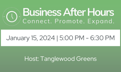 Join us on January 15th at Tanglewood Greens for another engaging event. Business After Hours is a great opportunity to make connections and develop your business in a casual environment.