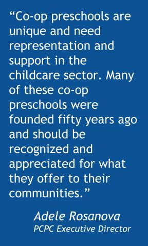 Executive Director since 2019, Adele Rosanova sees her main role as acting as liaison between her board of directors and the staff at the member centers. What has she learned in this time? Chiefly that “co-op preschools are unique and need representation and support in the childcare sector. Many of these co-op preschools were founded fifty years ago and should be recognized and appreciated for what they offer to their communities.”