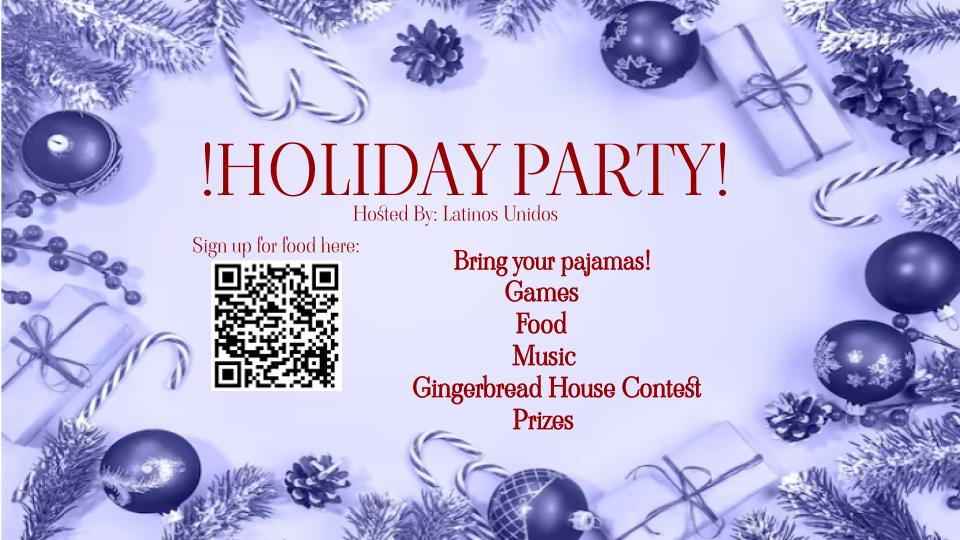 Latinos Unidos will be hosting a Holiday Pajama Party on December 18th, make sure to sign up to bring food in the Google Classroom. They will also be accepting toys to support the toy drive hosted by INHS.