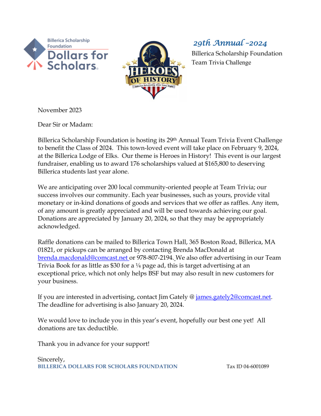 The Billerica Scholarship Foundation is collecting clothing, books, and small household items for its Fun Drive. All items collected will be weighed and BSF will be paid per pound for the items we collect. Those funds will then benefit the Class of 2024 in the form of scholarships.