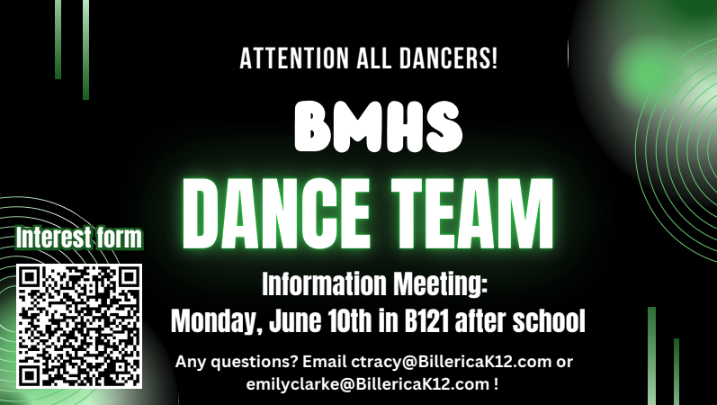 Attention All Dancers! There will be an informational meeting right after school on Monday June 10th in B121 for anyone interested in joining the Dance Team next school year! Please see Mrs. Tracy or Emily Clarke with any questions!