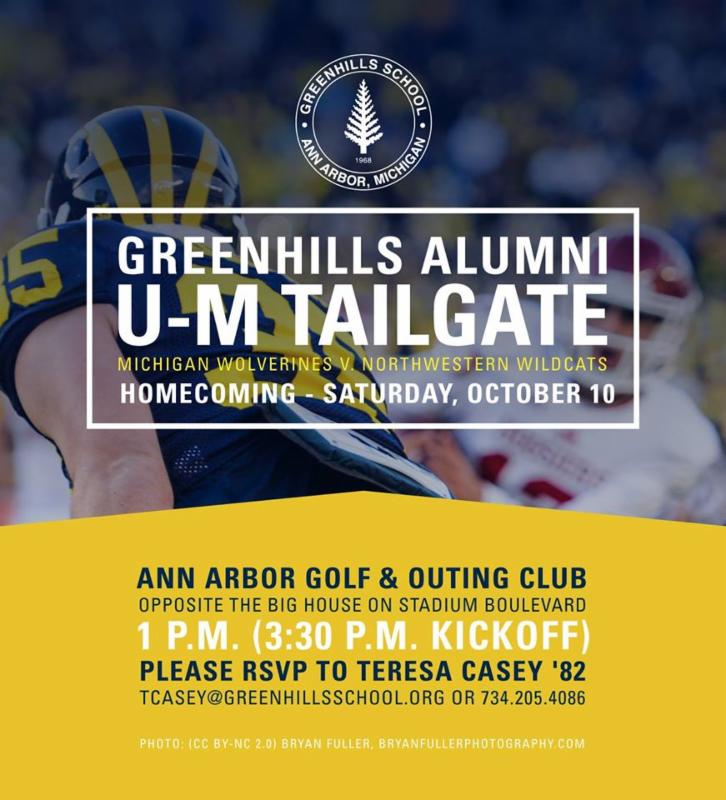 Football players understand the importance of a good pre-game meal. So should the fans. So why not stop by at the Greenhills Alumni U-M tailgate prior to the Wolverine's homecoming game Oct. 10? Look for the Greenhills balloons adorning our pavilion near the clubhouse at the Ann Arbor Golf & Outing Club, right across Stadium from the Big House.