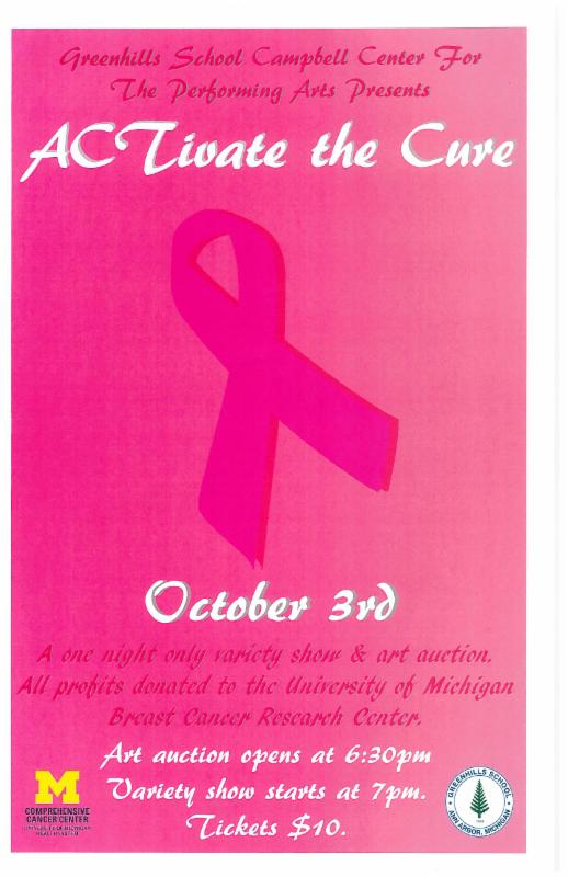 Save some time this weekend to check out ACTivate the Cure, Greenhills' annual student art auction and variety show benefiting the University of Michigan Breast Cancer Center. The art auction starts at 6:30 p.m. Saturday outside the Campbell Center for the Performing Arts, with the variety show getting underway at 7 p.m.